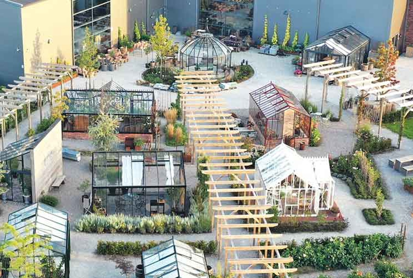 Drönarvy över Classicums utställning med växthus, orangerier, pergolor, uterum, skärmtak och inspirerande trädgårdsmiljöer. 180 kvm stor butik för trädgård & inredning.
