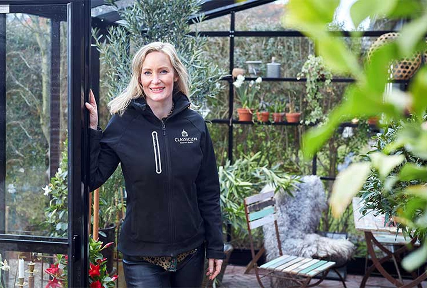 Kvinna står i ett Classicum-växthus omgiven av grönskande växter och inredning.