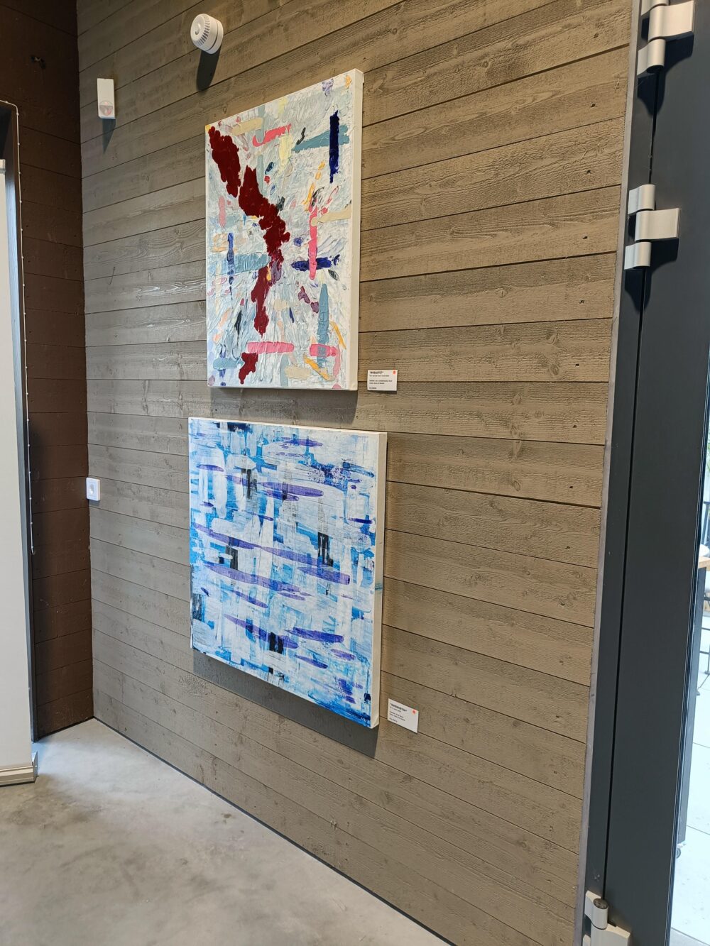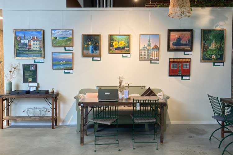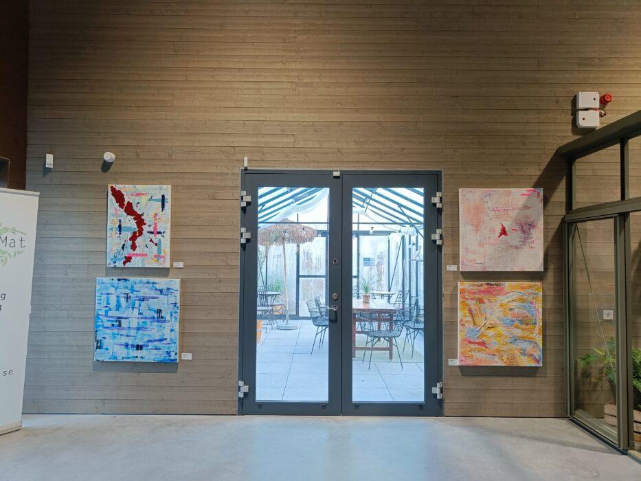 Våra ytor finns i vår cafédel och är en del av vår plats som många besökare vistas i en längre period. Verken hängs enkelt upp på galleriskenor (installerade efter att bilderna togs). Café och butik har öppet sju dagar i veckan och verken finns att beskåda under våra öppettider. Aktuella öppettider finns här.