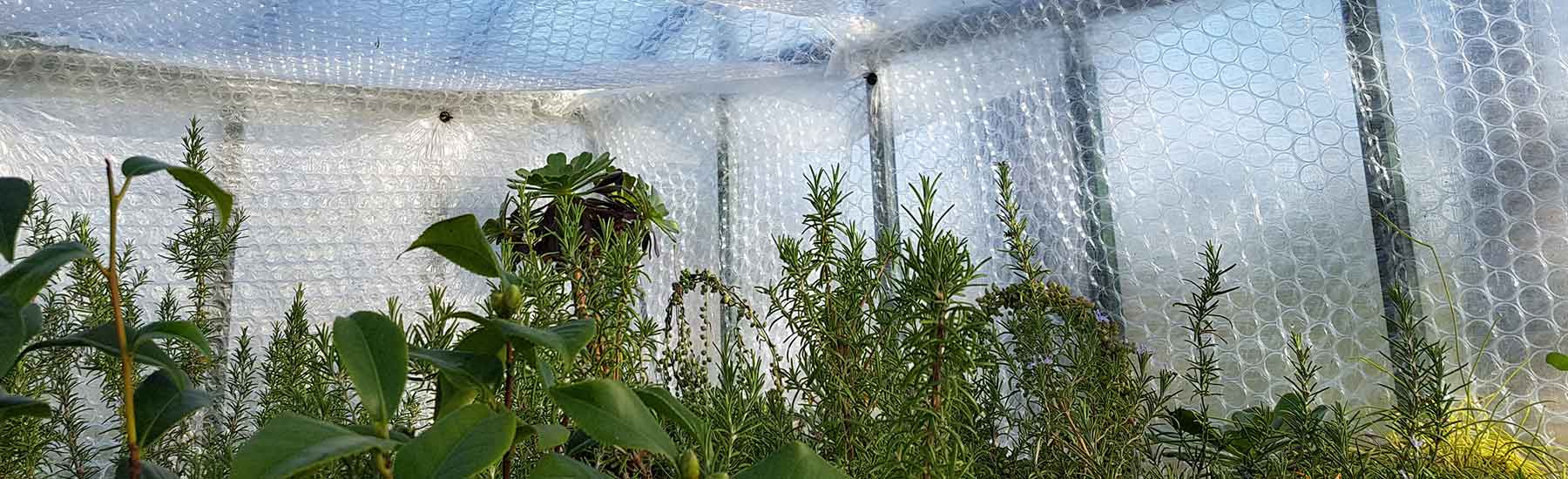 Om du inte fyller hela ytan av ditt växthus med övervintrande växter, kan du med fördel dela av rummet med bubbelplasten/bubbelfolien. Då behöver inte hela ytan användas för övervintrande växter. Du kan också sänka taket så att uppvärmningsvolymen blir mindre.