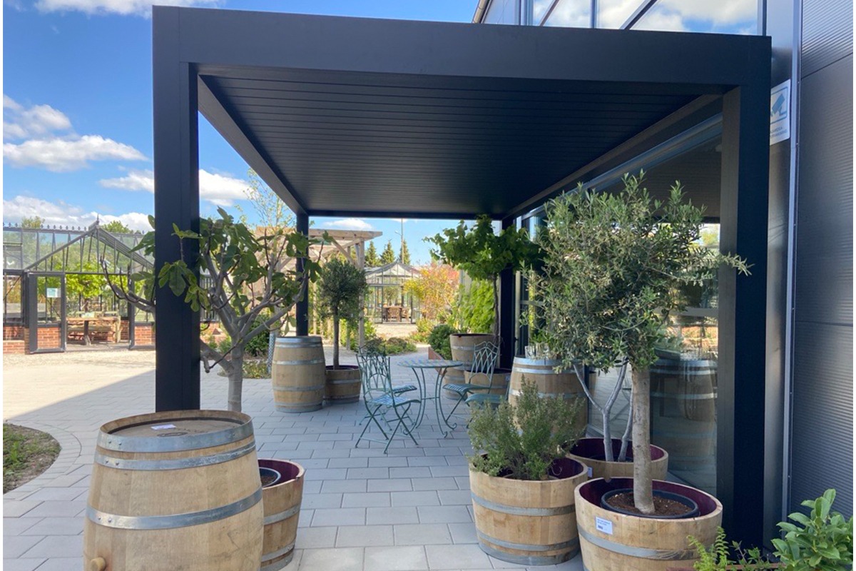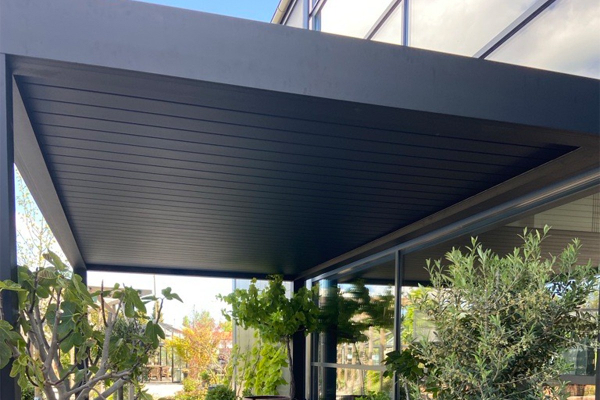 Fristående aluminiumpergola lackerad i RAL 7016 antracitgrå eller RAL 9005 svart.