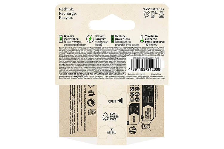 Till skillnad från engångsbatterier tål ReCyko låga temperaturer ner till -20°C och har lång livslängd med upp till 1000 laddningscykler. Dessutom är de tillverkade av mer än 10 % återvunnet material och hela 94 % av batteriet, inklusive förpackningen, är återvinningsbart.