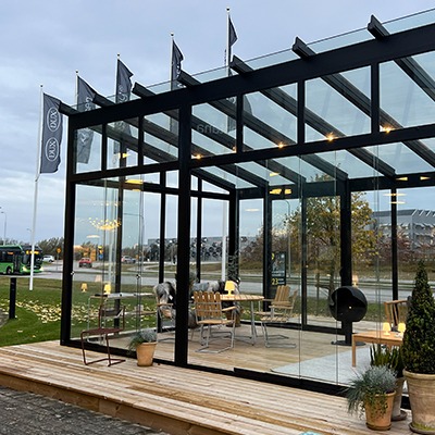 Uterum på Glashuset Malmö, byggt med Classicums Svenskproducerade CL Alu-system.