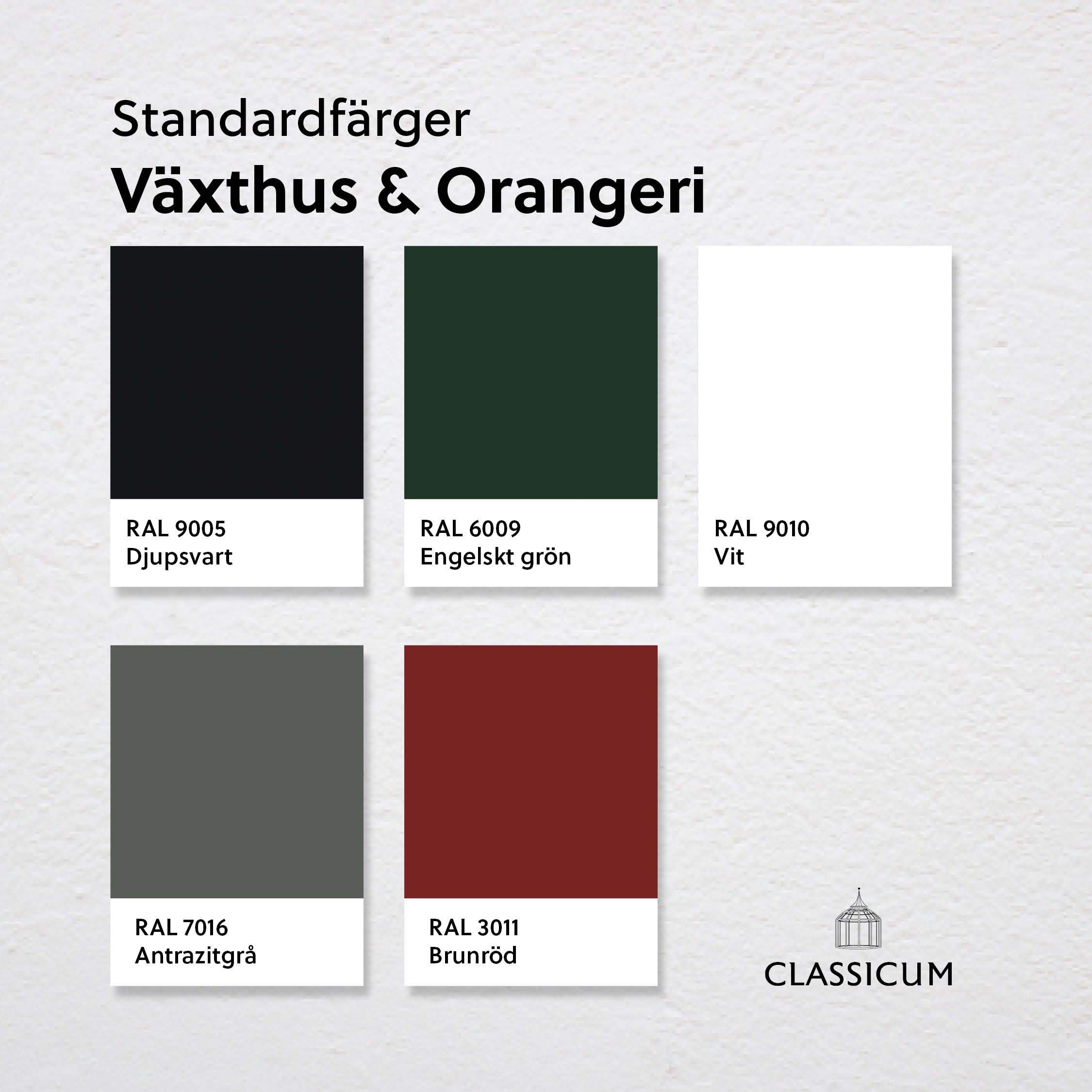 Många av våra växthus är lackerade som standard. Olika växthusmodeller har olika standard RAL-färger, se respektive produktisidor för vilka val du kan göra.